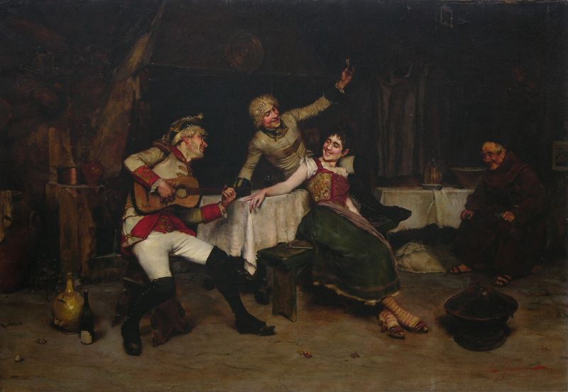 E Giachi ( 1800 - ) is an Italian painter. E Giachi s works have been put up for auction numerous times, with realized prices surpassing estimated prices, varying from 350 USD for Flower Seller in 2004 to 8740 USD for A tavern serenade in 2006 , based on the size and medium of the artwork.