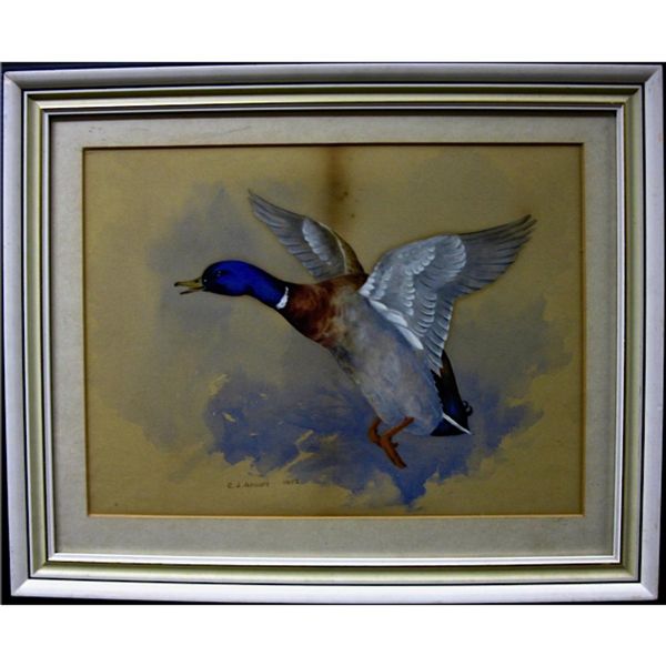 E J Amoore ( 1902 - ) is a British painter. E J Amoore s works have been put up for auction numerous times, with realized prices varying from 37.64 USD for study of an eagle guarding its nest on a rocky outcrop in 2008 to 58.43 USD for A Heron and Kingfisher; A mallard in 2011 , based on the size and medium of the artwork.