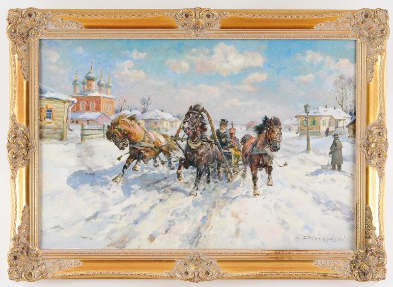E Pierzynski ( 1900 - ) is a Russian painter. E Pierzynski s works have been put up for auction numerous times, with realized prices surpassing estimated prices, varying from 173.8 USD for Sl√§ds√§llskap in 2004 to 1200 USD for Troika in winter pursued by wolves in 2008 , based on the size and medium of the artwork.
