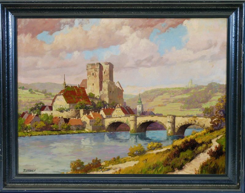 E Urbach ( 1872 - 1927 ) was a German painter. E Urbach s works have been auctioned off multiple times, with realized prices varying according to the size and medium of the artwork, for instance of 82.12 USD for lick über einen Fluss mit Steinbrücke auf ein Städtchen mit Burganlage in 2012