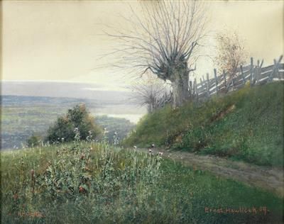 Ernst Hawlicek ( 1888 - 1938 ) was an Austrian painter. Ernst Hawlicek s works have been put up for auction numerous times, with realized prices surpassing estimated prices, varying from 227.99 USD for The garden path in 2005 to 672.31 USD for A landscape with Dachstein mountain in 2009 , based on the size and medium of the artwork.