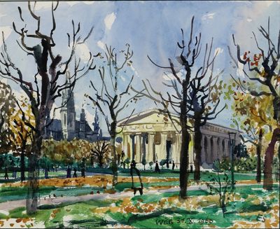 Ernst Schrom ( 1902 - 1969 ) was an Austrian painter. Ernst Schrom s works have been put up for auction numerous times, with realized prices surpassing estimated prices, varying from 724.75 USD for Hohe Warte Wien XIX in 2003 to 870.05 USD for The Theseustempel in the Volksgarten, Vienna Cityhall in the Background in 2006 , based on the size and medium of the artwork.