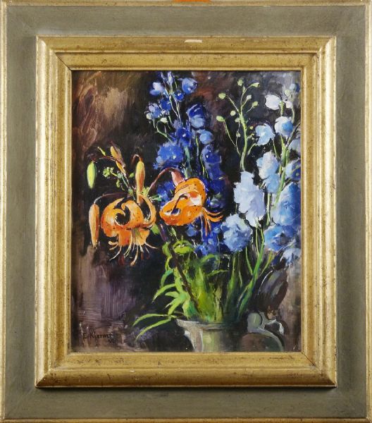 Ester Kjerner ( 1873 - 1952 ) was a painter. Ester Kjerner s works have been put up for auction numerous times, with realized prices surpassing estimated prices, varying from 805.95 USD for Drottningholmsmotiv in 2010 to 1177.93 USD for Riddarsporre och liljor in 2010 , based on the size and medium of the artwork.