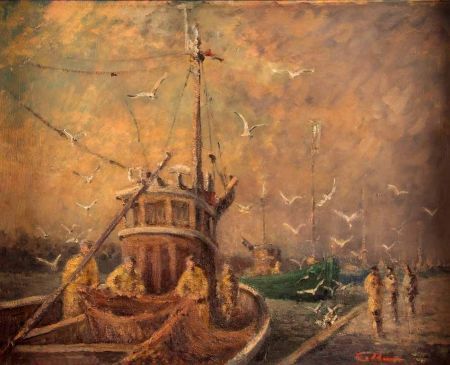 H E Collin ( - ) is a painter. H E Collin s works have been put up for auction numerous times, with realized prices varying from 39.8 USD for Upton Marshes, in 2005 to 139.66 USD for Lowestoft Harbour with Fishermen and Fishing Boats by the Quayside in 2009 , based on the size and medium of the artwork.