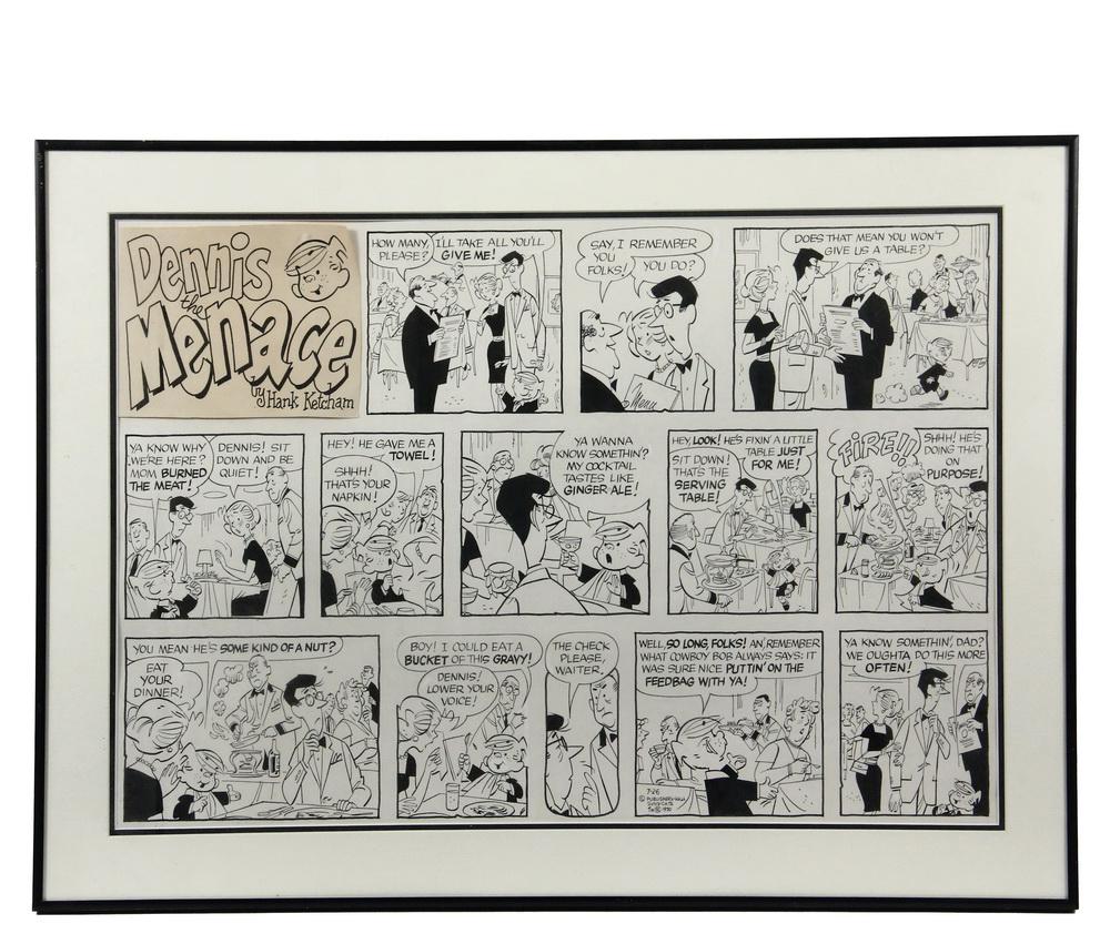 Hank Ketcham ( 1920 - 2001 ) was a painter. Hank Ketcham s works have been put up for auction numerous times, with realized prices varying from 200 USD for Unknown in 2008 to 400 USD for Dennis the Menace in 2016 , based on the size and medium of the artwork.