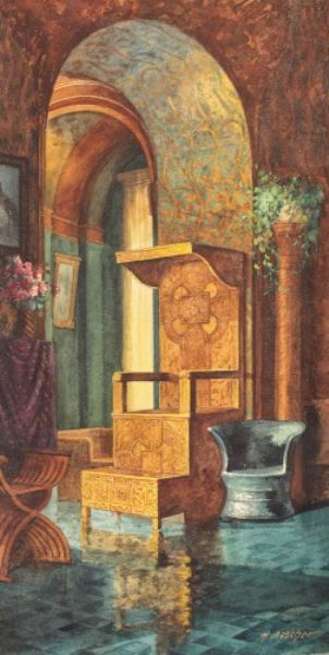 Hans Aescher ( 1866 - 1947 ) was a painter. Hans Aescher s works have been auctioned off multiple times, with realized prices varying according to the size and medium of the artwork, for instance of 973.86 USD for Camera de aur a Reginei Maria in 2013