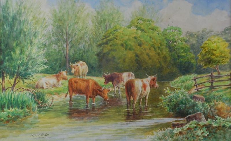 Henry J Rhodes ( 1882 - 1884 ) was a British painter. Henry J Rhodes s works have been put up for auction numerous times, with realized prices varying from 47.18 USD for Pastoral scene in 2004 to 75.74 USD for Cattle watering at a stream in 2009 , based on the size and medium of the artwork.