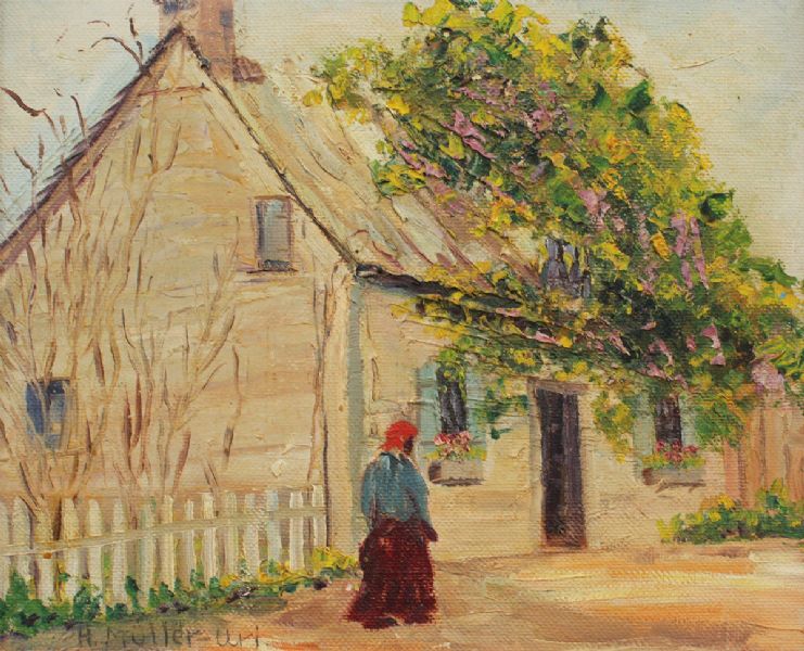 Hildegard Muller ( 1919 - ) is a German painter. Hildegard Muller s works have been auctioned off multiple times, with realized prices varying according to the size and medium of the artwork, for instance of 1000 USD for St. Augustine Street Scene depicting a Black Woman Outside a St. Augustine House in 2013