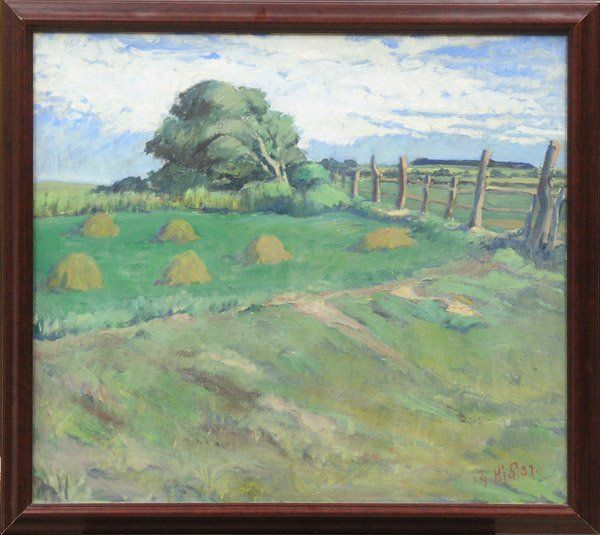 Hjalmar Sorensen ( 1881 - 1943 ) was a Danish painter. Hjalmar Sorensen s works have been auctioned off multiple times, with realized prices varying according to the size and medium of the artwork, for instance of 250 USD for Landscape with Haystacks [Nodebohuse, Denmark] in 2007