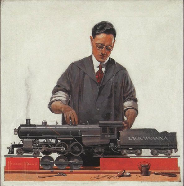 Howard V Brown ( 1869 - 1932 ) was an American painter. Howard V Brown s works have been auctioned off multiple times, with realized prices varying according to the size and medium of the artwork, for instance of 3105 USD for Man working on model train "Lackawanna" in 2007
