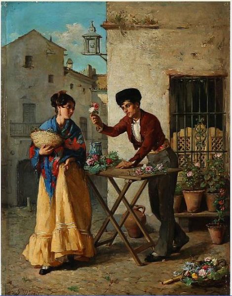 J Darnis ( - ) is a painter. J Darnis s works have been auctioned off multiple times, with realized prices varying according to the size and medium of the artwork, for instance of 280.1 USD for A woman is offered a flower of a gentleman in 2014