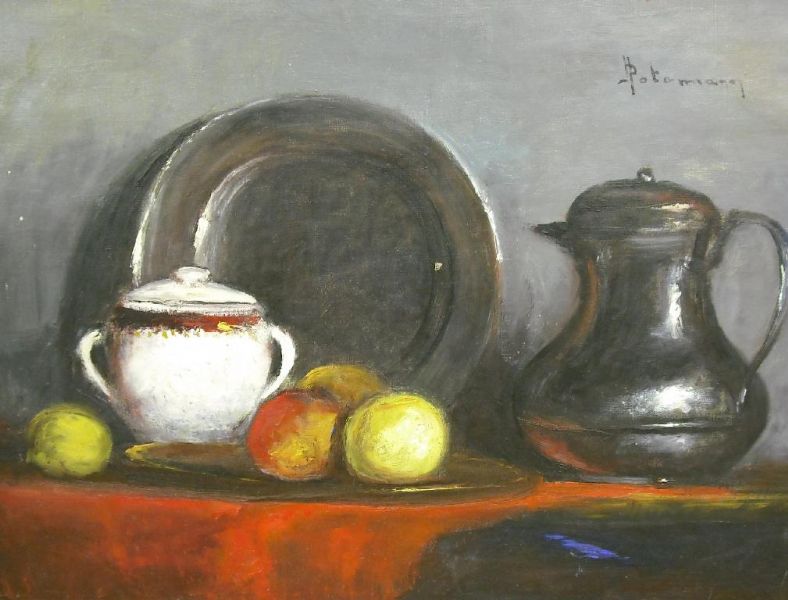 J Potamiann ( - ) is a painter. J Potamiann s works have been auctioned off multiple times, with realized prices varying according to the size and medium of the artwork, for instance of 350.71 USD for Still life with a pewter jug and plate with apples and a sucrier in 2009
