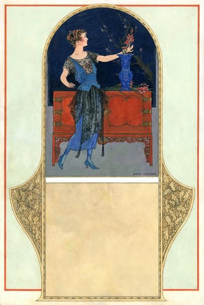 Jessie Gillespie ( - ) is a painter. Jessie Gillespie s works have been put up for auction numerous times, with realized prices surpassing estimated prices, varying from 2990 USD for Reclining woman in white gown on black divan. in 2009 to 3105 USD for Young woman in lace, arranging flowers in a chinese vase. in 2013 , based on the size and medium of the artwork.