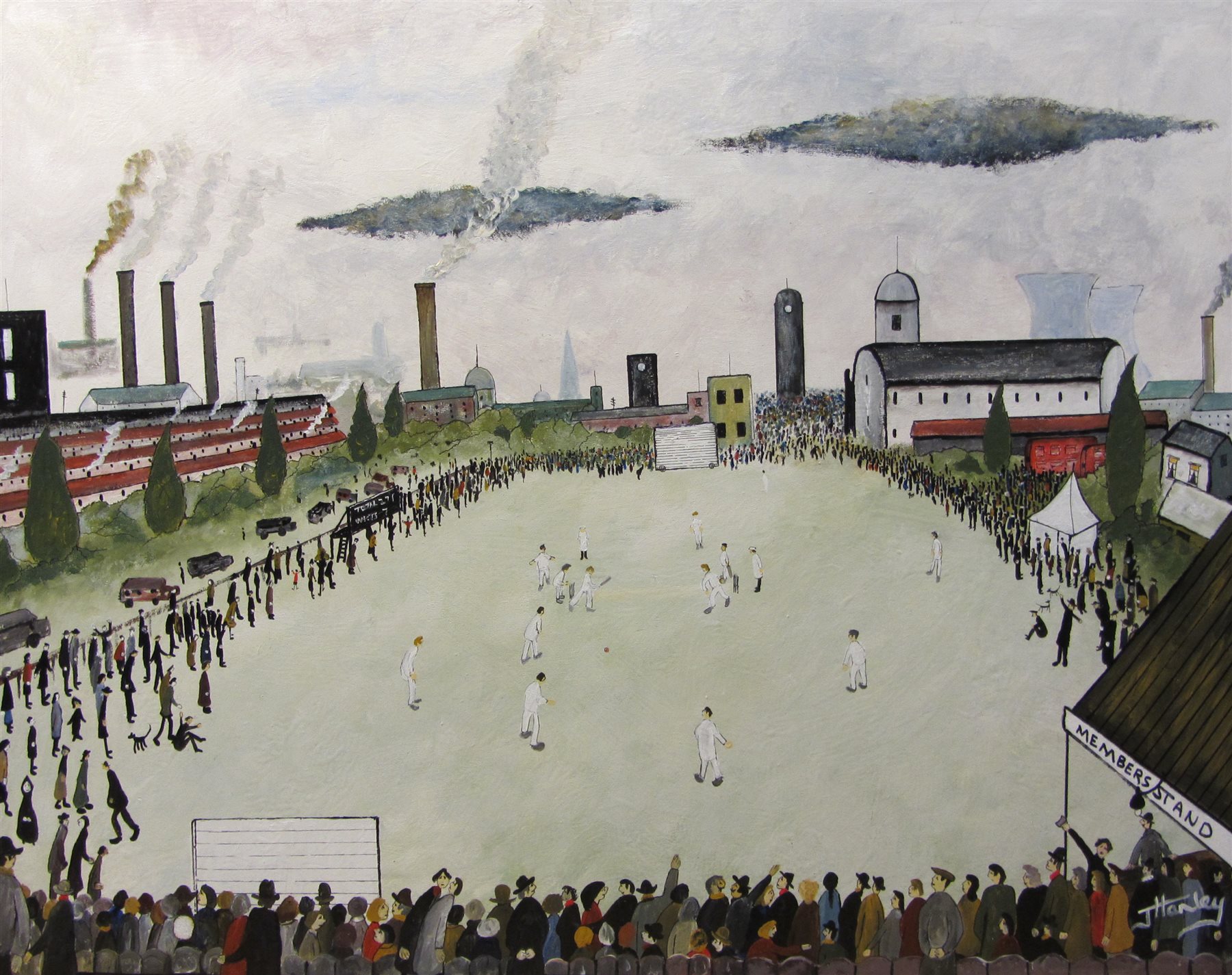 John Hanley ( 1947 - ) is a British painter. John Hanley s works have been put up for auction numerous times, with realized prices surpassing estimated prices, varying from 195.8 USD for The Boating Lake in 2016 to 629.37 USD for Cricket Match in 2016 , based on the size and medium of the artwork.