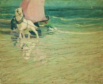 John Noble ( 1874 - 1934 ) was an American painter. John Noble s works have been put up for auction numerous times, with realized prices surpassing estimated prices, varying from 700 USD for Schooner with People in 2006 to 3857.31 USD for Towing the boat ashore in 2012 , based on the size and medium of the artwork.