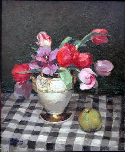 Jonkmans ( 1900 - ) is a Belgian painter. Jonkmans s works have been auctioned off multiple times, with realized prices varying according to the size and medium of the artwork, for instance of 129.59 USD for A vase of tulips and an apple in 2007