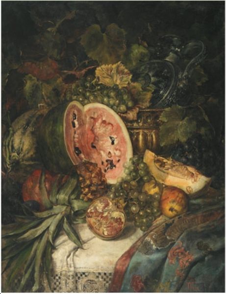 Josef Fux ( 1842 - 1904 ) was an Austrian painter. Josef Fux s works have been auctioned off multiple times, with realized prices varying according to the size and medium of the artwork, for instance of 3227.11 USD for STILL LIFE OF WATERMELON, GRAPES, POMEGRANTES, PINEAPPLE AND BRASS ON A LACE COVERED LEDGE in 2007
