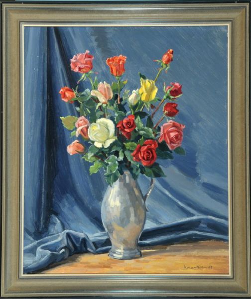 Josef Waldemar Keller kühne ( 1902 - ) is a German painter. Josef Waldemar Keller kühne s works have been auctioned off multiple times, with realized prices varying according to the size and medium of the artwork, for instance of 235.37 USD for Bunter Rosenstrau√ü in einem Krug vor blauer Draperie in 2012
