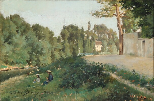 Jules Charles Bricoux ( - ) is a painter. Jules Charles Bricoux s works have been auctioned off multiple times, with realized prices varying according to the size and medium of the artwork, for instance of 416.83 USD for View from a French town with two girls sitting by the grassy banks of a river in 2019