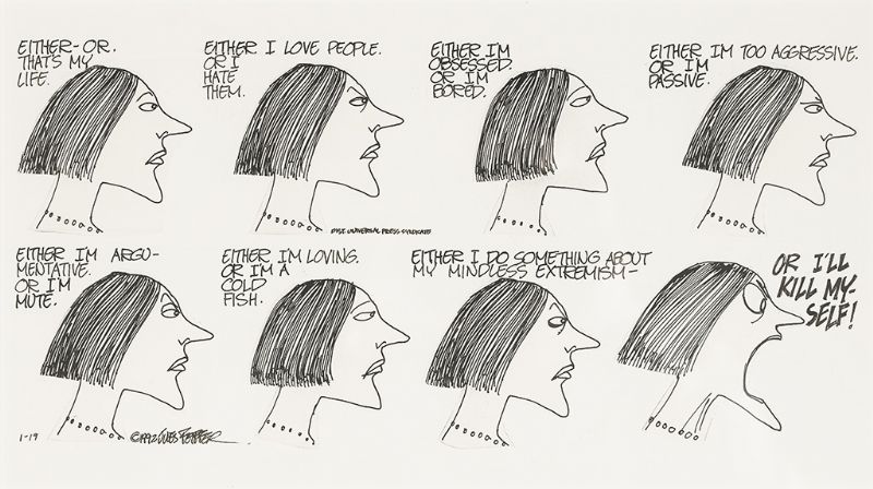 Jules Feiffer ( 1929 - ) is an American painter. Jules Feiffer s works have been put up for auction numerous times, with realized prices surpassing estimated prices, varying from 400 USD for I HAVE TROUBLE in 2004 to 1750 USD for Either - Or. That's My Life in 2014 , based on the size and medium of the artwork.