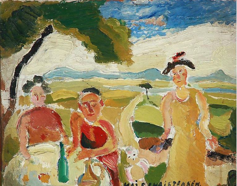 Kai E Christensen ( 1927 - ) is a Danish painter. Kai E Christensen s works have been put up for auction numerous times, with realized prices surpassing estimated prices, varying from 94.47 USD for Two compositions with houses in 2006 to 668.95 USD for At a table in the summer garden in 2012 , based on the size and medium of the artwork.