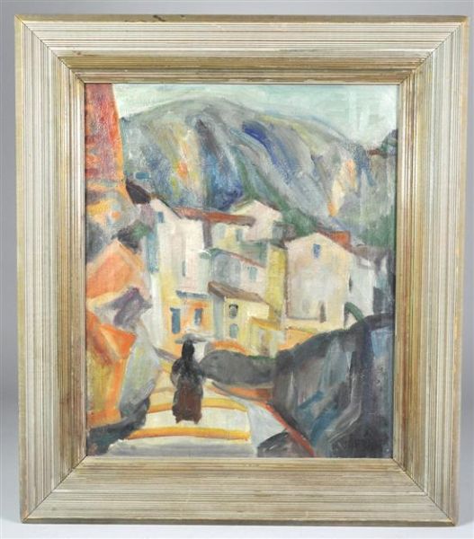 M Frinta ( - ) is a painter. M Frinta s works have been auctioned off multiple times, with realized prices varying according to the size and medium of the artwork, for instance of 106 USD for Mountains and village, with figure on stepped walkway. in 2010