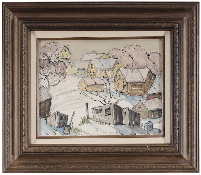 Marian Hungerford ( - ) is an American painter. Marian Hungerford s works have been put up for auction numerous times, with realized prices varying from 125 USD for River Landscape in 2004 to 236 USD for Winter View of a New England Town in 2013 , based on the size and medium of the artwork.