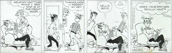 Murat Chic Young ( 1901 - 1973 ) was a painter. Murat Chic Young s works have been put up for auction numerous times, with realized prices varying from 365 USD for Dagwood gets a token of the boss' esteem in 2005 to 373 USD for Dagwood holds Blondie's knitting and leaves a visitor with the wrong impression. in 2006 , based on the size and medium of the artwork.