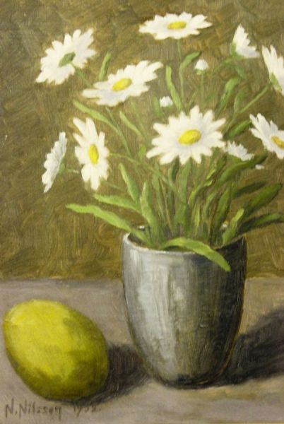 N Nilsson ( - ) is a painter. N Nilsson s works have been put up for auction numerous times, with realized prices surpassing estimated prices, varying from 41.61 USD for Blomstilleben in 2008 to 48.49 USD for Stilleben in 2015 , based on the size and medium of the artwork.