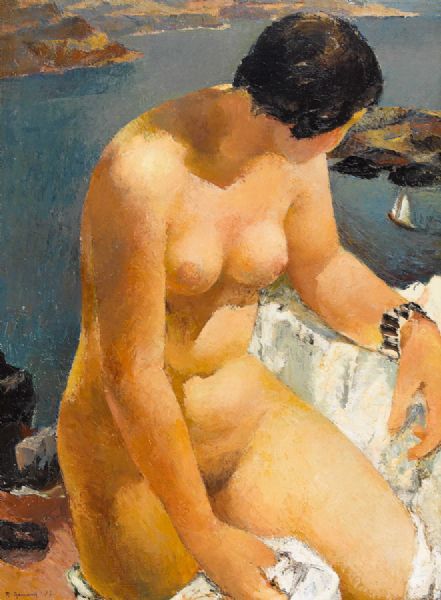 Nanette Genoud ( 1907 - 1987 ) was a Swiss painter. Nanette Genoud s works have been put up for auction numerous times, with realized prices surpassing estimated prices, varying from 849.47 USD for Sommerliche Landschaft mit von B√§umen ges√§umtem Weg. in 2004 to 3699.9 USD for La baigneuse. in 2013 , based on the size and medium of the artwork.