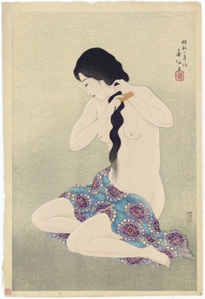 Natori Shunsen ( 1886 - 1960 ) was a Japanese painter. Natori Shunsen s works have been put up for auction numerous times, with realized prices surpassing estimated prices, varying from 225 USD for portraying the Kabuki actor Nakamura Utaemon as Yodogimi in 2004 to 2750 USD for Nude combing her hair, 1928 in 2007 , based on the size and medium of the artwork.