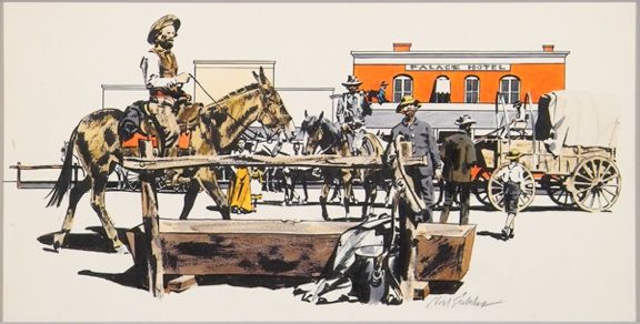 Noel Douglas Sickles ( 1911 - 1982 ) was an American painter. Noel Douglas Sickles s works have been put up for auction numerous times, with realized prices surpassing estimated prices, varying from 287 USD for Two girls working at machine. in 2006 to 1035 USD for Western street scene. in 2013 , based on the size and medium of the artwork.
