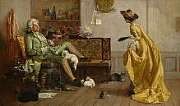 Percy Thomas Macquoid ( 1852 - 1925 ) was a British painter. Percy Thomas Macquoid s works have been put up for auction numerous times, with realized prices surpassing estimated prices, varying from 913.66 USD for A lady standing in an interior, holding a peacock, with two dogs at her side in 2003 to 3024.7 USD for A PROMENADE, HAMPTON COURT in 2003 , based on the size and medium of the artwork