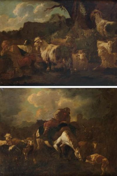 Philippe Peter Roos ( 1657 - 1706 ) was a painter. Philippe Peter Roos s works have been auctioned off multiple times, with realized prices varying according to the size and medium of the artwork, for instance of 8974.18 USD for Troupeau, berger, cheval et chien près d'un abreuvoir in 2011