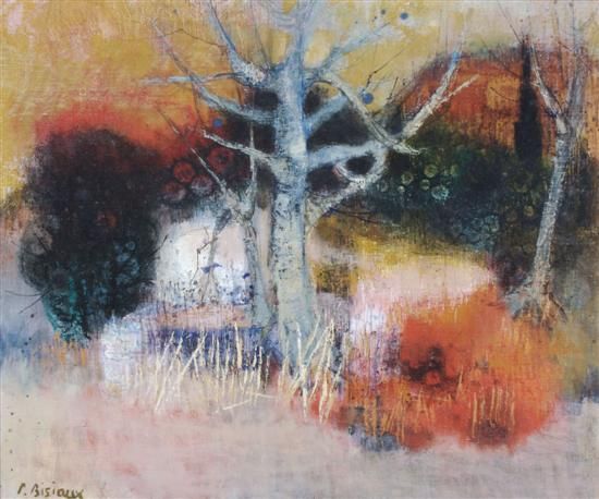 Pierre Bisiaux ( 1924 - ) is a French painter. Pierre Bisiaux s works have been put up for auction numerous times, with realized prices surpassing estimated prices, varying from 350 USD for Table Top Still Life of Oranges and a Pear in 2005 to 1800 USD for Red Forest in 2008 , based on the size and medium of the artwork.