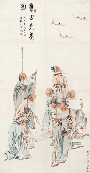Qian Luxin ( 1900 - ) is a painter. Qian Luxin s works have been put up for auction numerous times, with realized prices surpassing estimated prices, varying from 458.1 USD for Gelehrte beim Weintrinken an einem Tisch unter Bäumen. Auf dem kleinen Fluß schwimmen Weintassen. Illustration zum Landing-Vorwo in 2004 to 27618.21 USD for Drinking in the Orchard/Calligraphy in 2014 , based on the siz