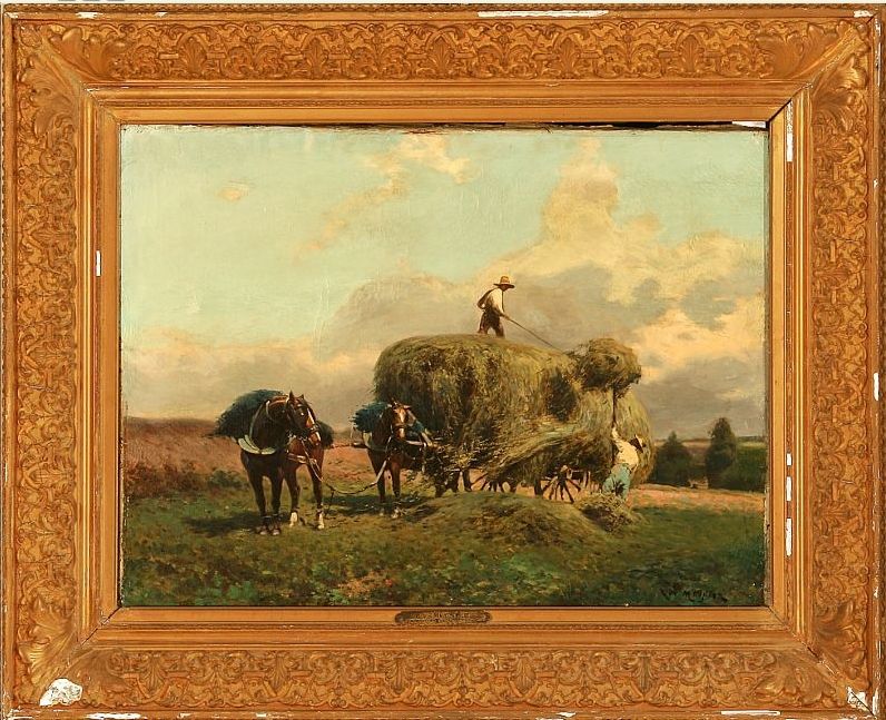 R V Meunier ( - ) is a painter. R V Meunier s works have been auctioned off multiple times, with realized prices varying according to the size and medium of the artwork, for instance of 423.6 USD for Two grooms stack grass on a horse carriage. in 2010