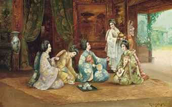 R Yoshida ( 1868 - 1912 ) was a painter. R Yoshida s works have been auctioned off multiple times, with realized prices varying according to the size and medium of the artwork, for instance of 344.66 USD for Japanese ladies taking tea, with a garden beyond in 2011