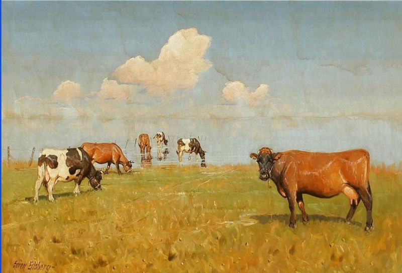 Soren Edsberg ( 1945 - ) is a Danish painter. Soren Edsberg s works have been put up for auction numerous times, with realized prices surpassing estimated prices, varying from 30.24 USD for Sommerdag med køer på marken. in 2004 to 747 USD for A Grazing Horse and A Holstein Cow in 2004 , based on the size and medium of the artwork.