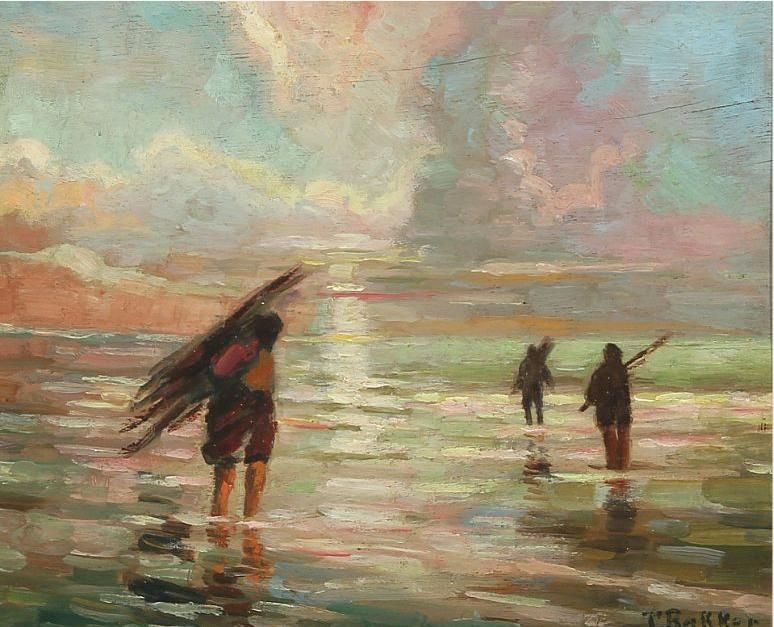 Teun Bakker ( 1894 - 1956 ) was a Dutch painter. Teun Bakker s works have been put up for auction numerous times, with realized prices surpassing estimated prices, varying from 71.13 USD for Stilleven met appels in blauwe kom in 2008 to 106.55 USD for Dutch fishermen on the beach in 2011 , based on the size and medium of the artwork.