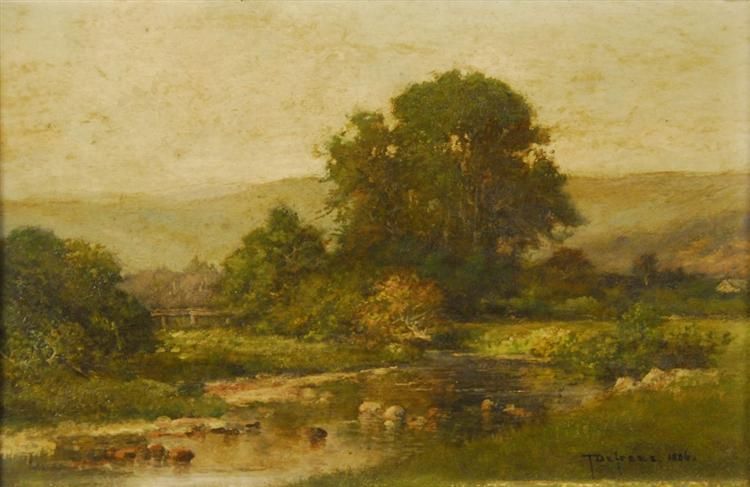 Thadeus Defrees ( 1855 - 1888 ) was a painter. Thadeus Defrees s works have been put up for auction numerous times, with realized prices surpassing estimated prices, varying from 517 USD for NEW HAMPSHIRE LANDSCAPE WITH STREAM in 2011 to 4182 USD for Morning in Venice--Dogana (Custom House) and Church of the Santa Maria della Salute in 2014 , based on the size and medium of the artwork.