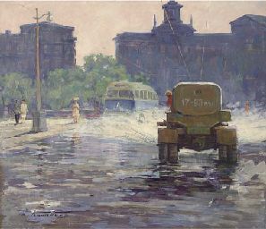 Victor Koshevoi ( 1924 - ) is a Russian painter. Victor Koshevoi s works have been put up for auction numerous times, with realized prices surpassing estimated prices, varying from 162.77 USD for On the Beach in 2005 to 4320 USD for At the weekend in 2005 , based on the size and medium of the artwork.