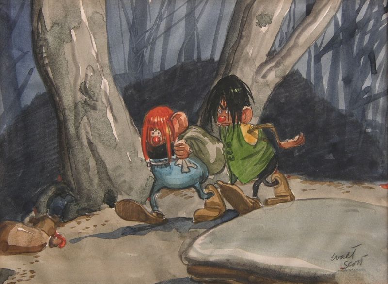 Walt Scott ( 1894 - 1970 ) was an American painter. Walt Scott s works have been put up for auction numerous times, with realized prices varying from 450 USD for Cartoon illustration of a little person on a cliff with rotted tree root in stormy weather in 2004 to 600 USD for Cartoon illustration of a little person in a forest in 2004 , based on the size and medium of the artwork.