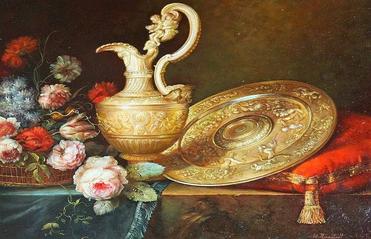 Wilhelm Nienstedt ( - ) is a painter. Wilhelm Nienstedt s works have been auctioned off multiple times, with realized prices varying according to the size and medium of the artwork, for instance of 218.15 USD for Still Life - Cushion, Silver and Flowers on a Ledge in 2013