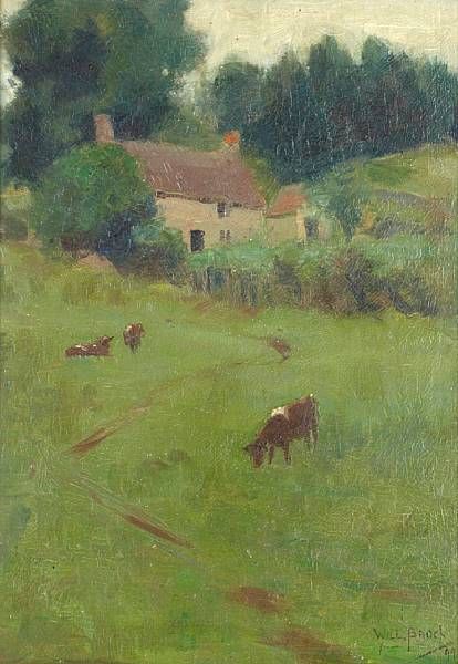 William Brock ( 1874 - 1953 ) was a British painter. William Brock s works have been put up for auction numerous times, with realized prices surpassing estimated prices, varying from 215.14 USD for TAKING A BREAK in 2005 to 300.16 USD for Harvest scene in the village of Pressagny-L'Orgueilleuse, Normandy in France in 2005 , based on the size and medium of the artwork.