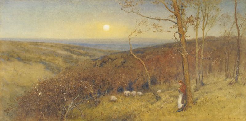 William Eyre Walker ( 1847 - 1930 ) was a British painter. William Eyre Walker s works have been put up for auction numerous times, with realized prices surpassing estimated prices, varying from 111.86 USD for 'The end of the summer - a quiet pool' in 2005 to 724.19 USD for Russet Woodlands, Shepherdess and Sheep beside an Orchard with an Extensive Landscape Beyond in 2006 , based on the size an