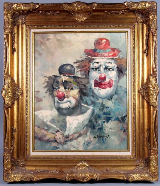 William Moninet ( 1937 - 1999 ) was an American painter. William Moninet s works have been put up for auction numerous times, with realized prices varying from 12.41 USD for Portrait of a clown in 2011 to 104.83 USD for Les clowns in 2015 , based on the size and medium of the artwork.