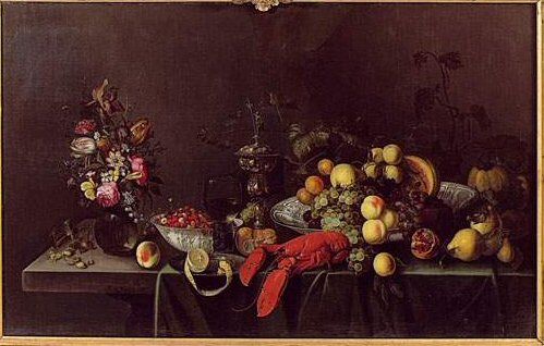 Nature morte au homard, fruits et bouquet de fleurs sur un entablement
