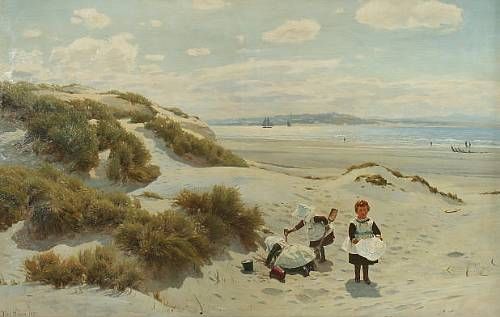 Children on the beach by the dunes,