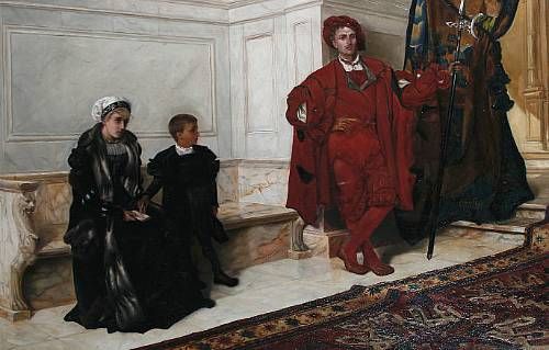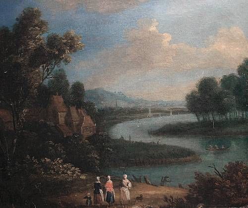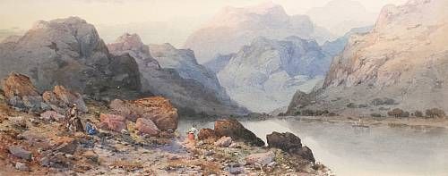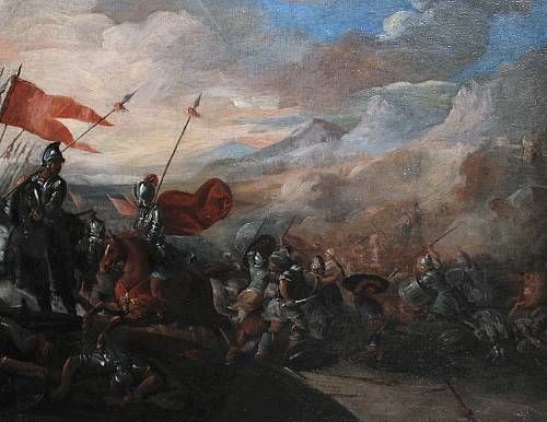 A battle scene with mountains beyond and two cavalrymen in the foreground